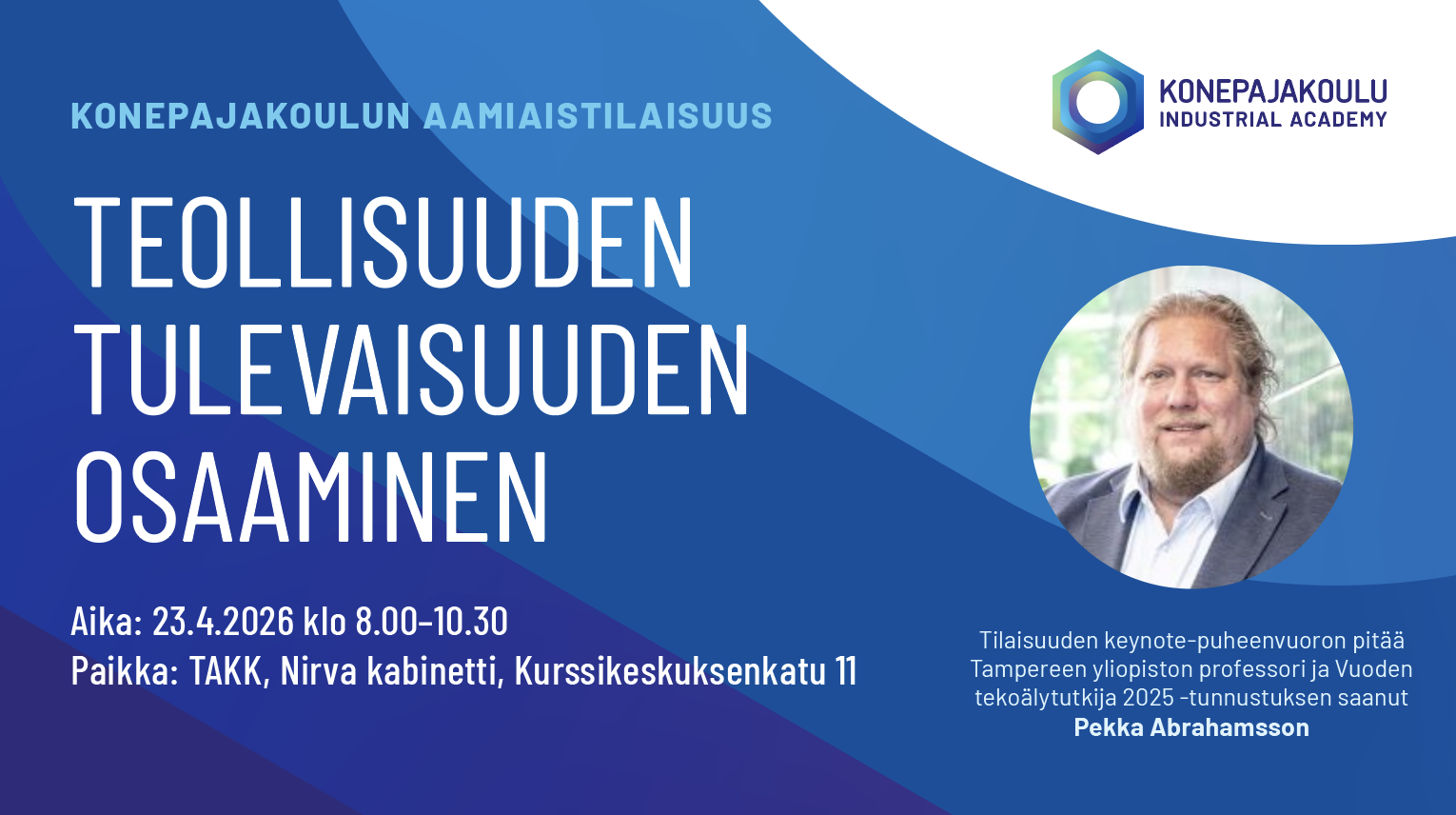 Tervetuloa mukaan Konepajakoulun aamiaistilaisuuteen 23.4.2026 kuulemaan ajankohtaista näkymää konepajateollisuuden osaamistarpeista, tekoälyn hyödyntämisestä osaamisen kehittämisessä sekä kansainvälisen osaajarekrytoinnin ja tilauskoulutuksen ratkaisuista yritysten tarpeisiin. Lue lisää