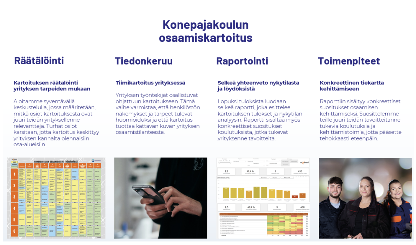 Konepajakoulun osaamiskartoituspalvelu tuo mukanaan pitkälle räätälöidyt koneistajan ja koneenasentajan osaamiskartat, mobiilikyselyn.